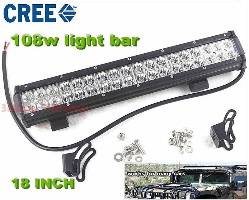 Light Source: LED Model: 18″ 108W Cree Led Chip Manufacturer: Cree Wattage:108 Operating Voltage: 10-30V DC Waterproof rate: IP 67 Beam Pattern: Flood beam and Spot beam Color Temperature: 6000K (pure white) Material: Diecast aluminum housing Lens material: PMMA lens Mounting Bracket: Stainless Steel Lumens Output: 8600 LM LED Power: 108W ( 36pcs*3w CREE high intensity LEDs ) This Light is manufactured with high power Cree Led’s Enhance your off-road lighting with a Double Row CREE LED Work Light Bar.